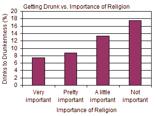 In one of the largest studies of its kind, the University of North Carolina at Chapel Hill examined the role of religion in the lives of nearly 2500 adolescents.9 The adolescents indicated the level of their indoctrination (i.e., frequency of church attendance) and importance of religion, along with a number of activities that they have or have not participated in. Listed below are graphs of behaviors that would generally be considered to be unfavorable. To see larger versions of the graphs, just hover your cursor over the thumbnail image.