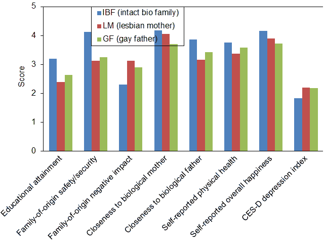 There has been much rhetoric on both sides of the gay marriage issue. One of the claims of those opposed to gay marriage is that gays make poor parents (although marriage is not a legal requirement for being a parent). Although the Regnerus study shows that intact biological families are superior for raising children, it also shows that non-intact families are inferior on average, regardless of the sexual preferences of the parents. When all the data of the Regnerus study are combined into gay vs. straight, many of the differences between the groups tend to disappear, although some deficits still exist for children raised by gay parents. The random selection method of Regnerus is far superior to the biased subject selection methods used in previous studies. However, in order to definitively study children raised through gay parenting, a sample size much larger than 3,000 would be required, if there were to be a comparison of intact biological parents vs. intact gay parents.